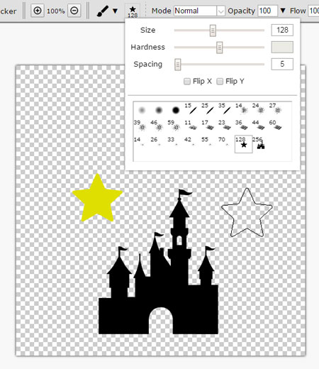 Open the brush type manager in the file menu, choose two PNG files to create STAR and CASTLE brush types.