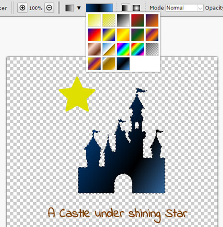 First, we use magic wand tool to select castle area, then, use gradient tool to fill castle with your own gradient style.